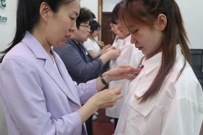 现场领导老师与优秀团员代表为新团员逐一颁发团务用品、佩戴团徽。当闪亮的团徽佩戴在胸前,新团员们眼中闪烁着荣耀与坚定,老团员代表以“传帮带”的形式,将共青团的精神与使命代代传递。